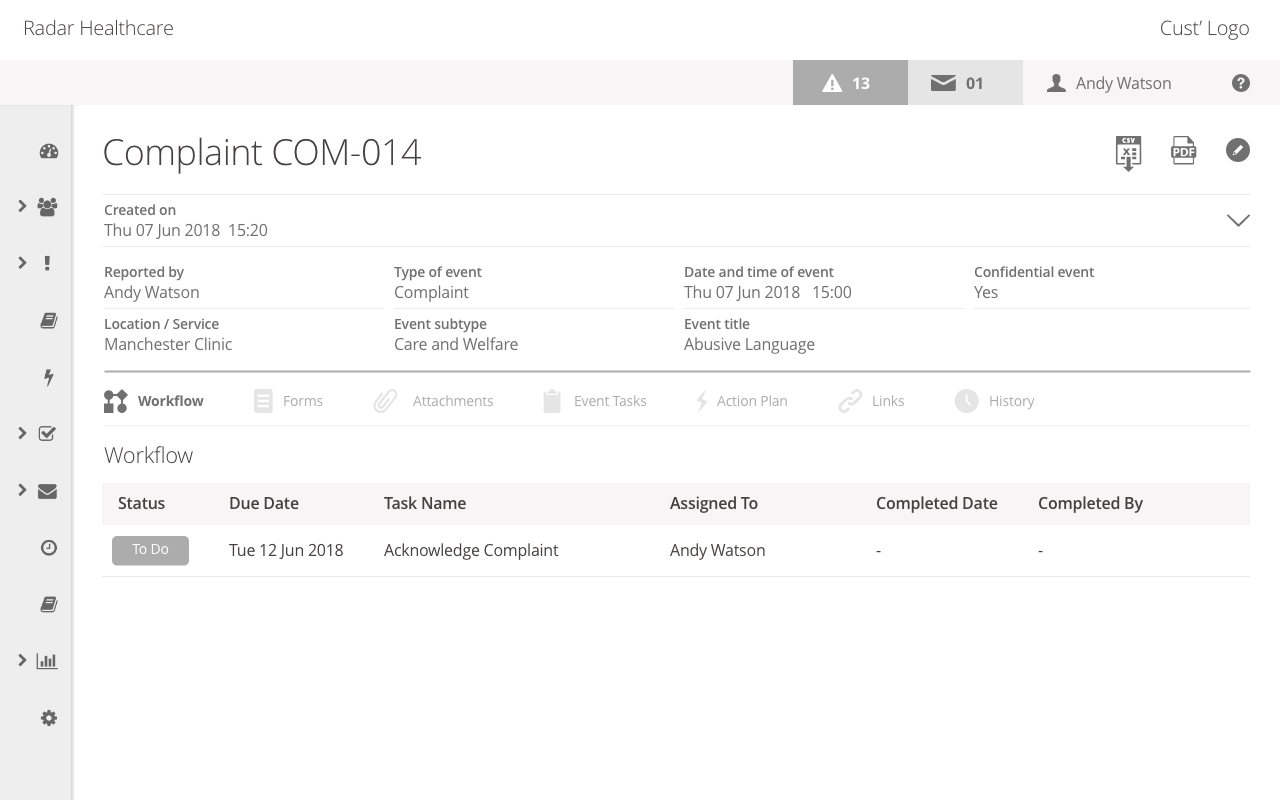 Radar allows healthcare providers to stay compliant by following each organisation’s particular processes and practices. It records events, risk assessments and audits create action plans to mitigate and resolve issues, tracks workforce training and appraisals.